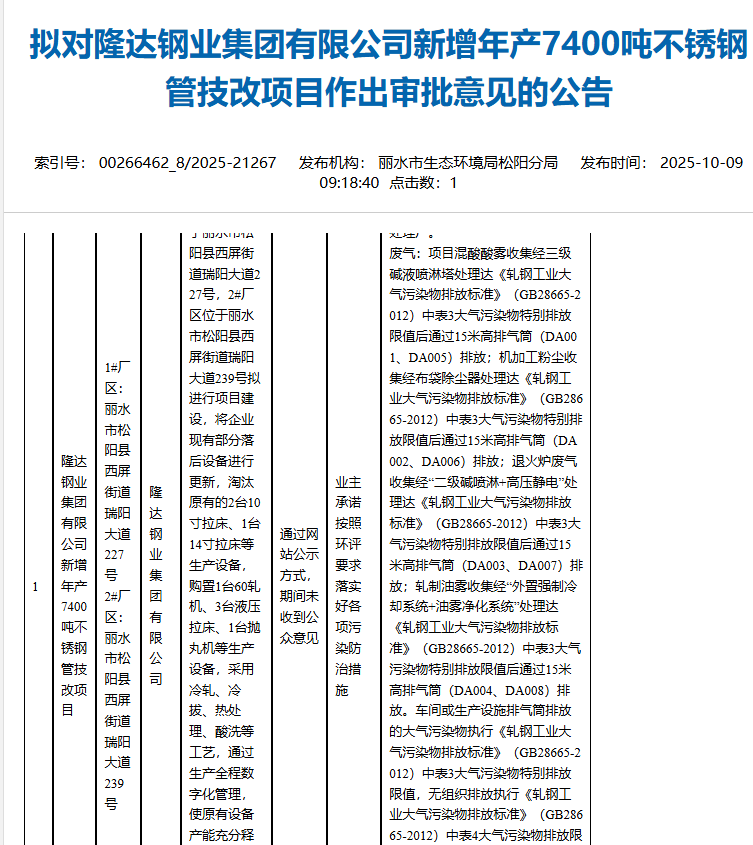 2025年10月9日,麗水市生態(tài)環(huán)境局松陽分局?jǐn)M對(duì)隆達(dá)鋼業(yè)集團(tuán)有限公司新增年產(chǎn)7400噸不銹鋼管技改項(xiàng)目作出審批意見并對(duì)外進(jìn)行公告,公告期為:2025年10月9日至2025年10月14日(5個(gè)工作日)。